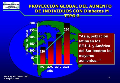 Asia, población latina en los EE.UU. y América del Sur tendrán los mayores aumentos Número (millones) Este gráfico muestra la proyección del número de personas diabéticas para el año 2025, siendo que América Latina contribuirá con uno de los mayores aumentos AÑO. McCarthy and Zimmet H King et al