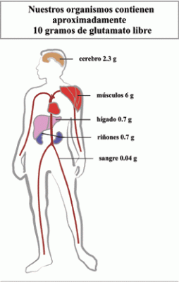 El ser humano necesita a nivel de su sistema nervioso glutamato, útil para el normal funcionamiento de dicho sistema, interviene activamente en la transmisión nerviosa y cumple parte activa en la visión. Se encuentra además en los músculos, las vísceras y la sangre, cumpliendo funciones.